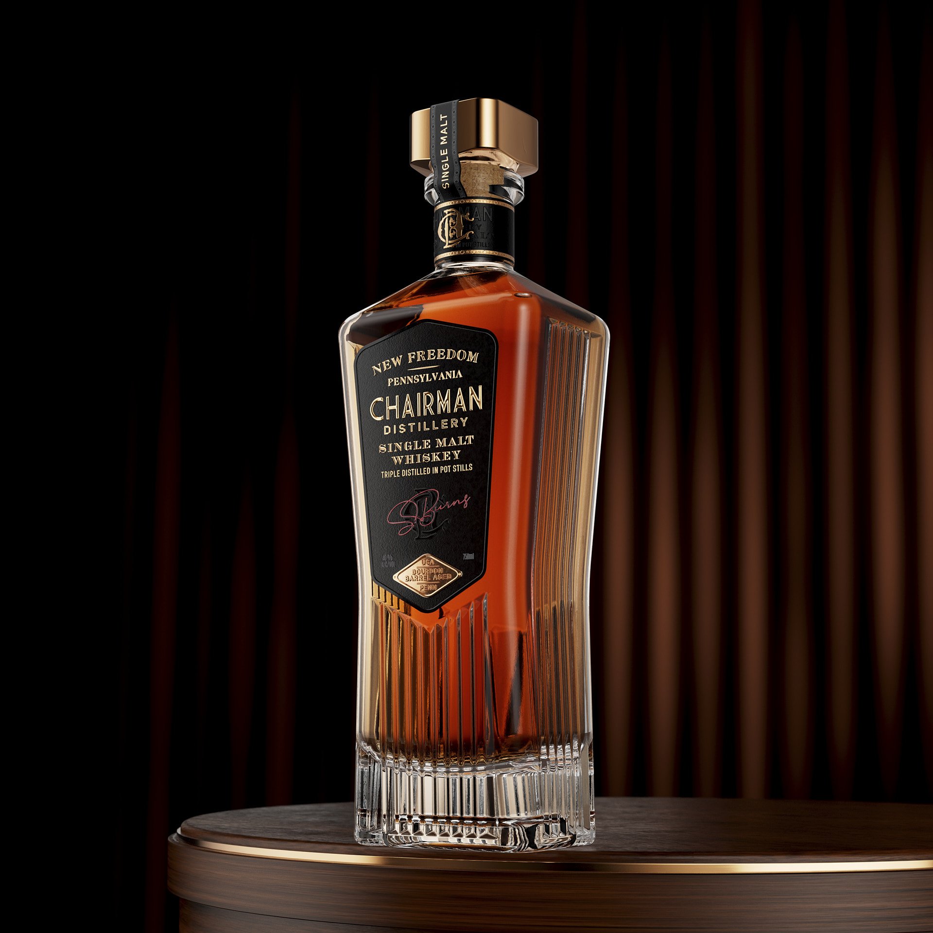 The packaging design for Chairman Distillery brings the brand’s vision to life with a mix of bold aesthetics and practical design. Taking cues from the Art Deco era, the custom bottle showcases strong geometric lines and vertical fluting, which give it a distinct and stylish look. It’s angular shape is both eye-catching and easy to handle, while the heavy base and clear glass highlight the quality of the whiskey. The bespoke closure, featuring gold and black accents, balances style with functionality.