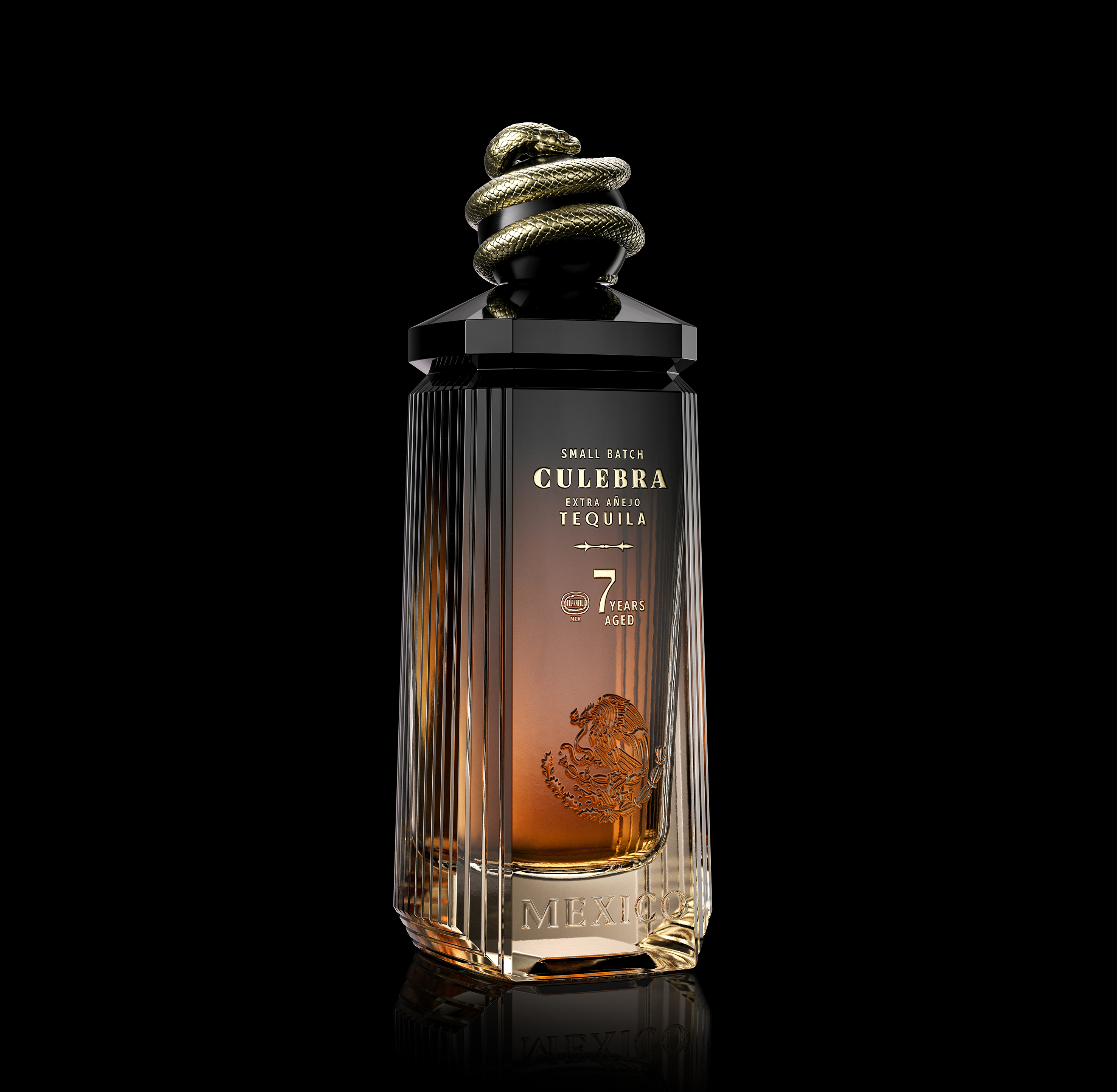 At the crown of the bottle rests the Culebra (snake)—a symbol deeply woven into the fabric of Mexican identity. The bronze-finished serpent represents wisdom, rebirth, and the earth’s vital energy.