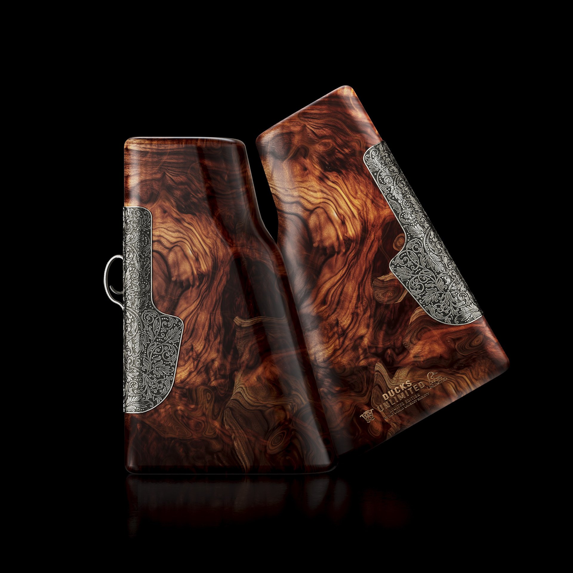 Special edition packaging design for Ducks Unlimited & World Whiskey Society. The exterior is crafted to resemble a shotgun stock, with polished burl wood featuring intricate natural swirls and grains that exude a refined, organic aesthetic. A metallic inlay with engraved filigree patterns runs along the side, adding an element of craftsmanship and elegance. The branding is discreetly placed at the base, complementing the overall premium feel and aligning with a nature-inspired, hunting theme. The box incorporates a unique functional detail, opening by pulling a trigger, mimicking the functionality of a shotgun. Inside, the green velvet-textured lining, complete with embossed patterns, enhances the sense of luxury and bespoke artistry. The packaging houses an elegant decanter-style bottle, further emphasizing exclusivity and the attention to detail in its craftsmanship.