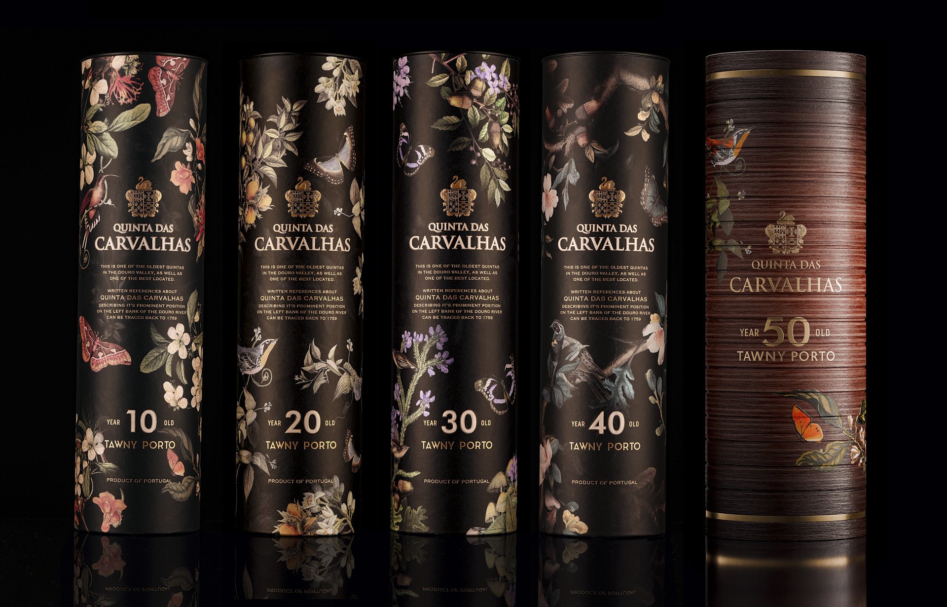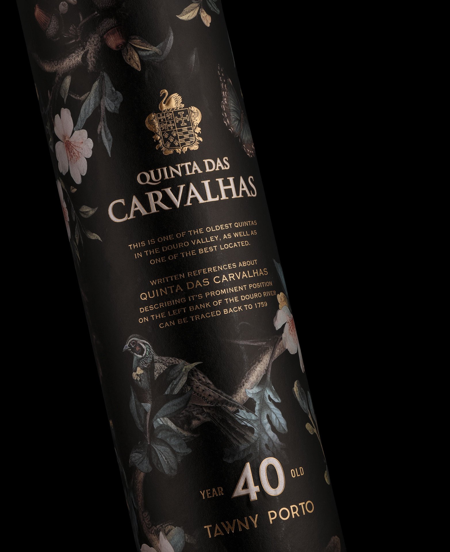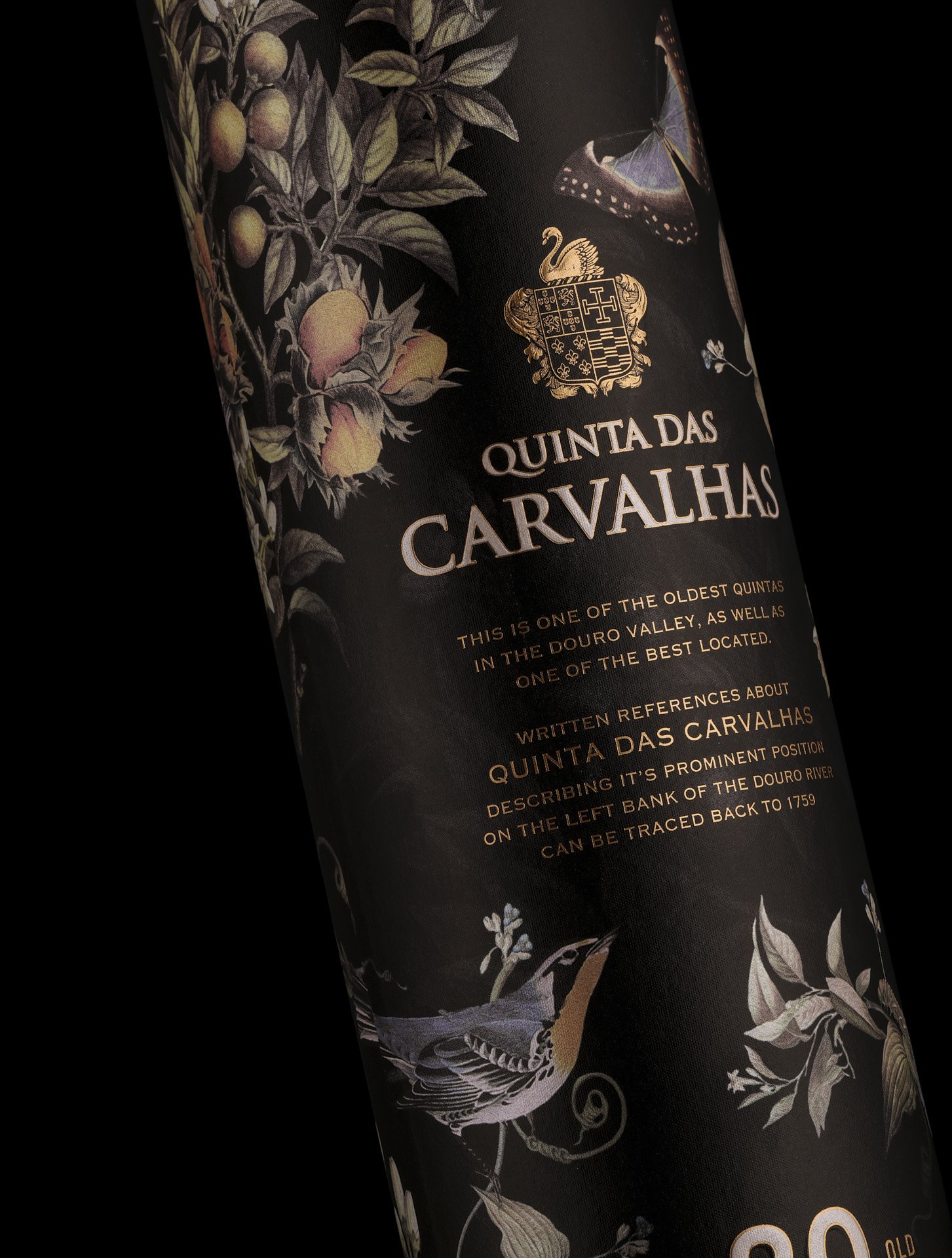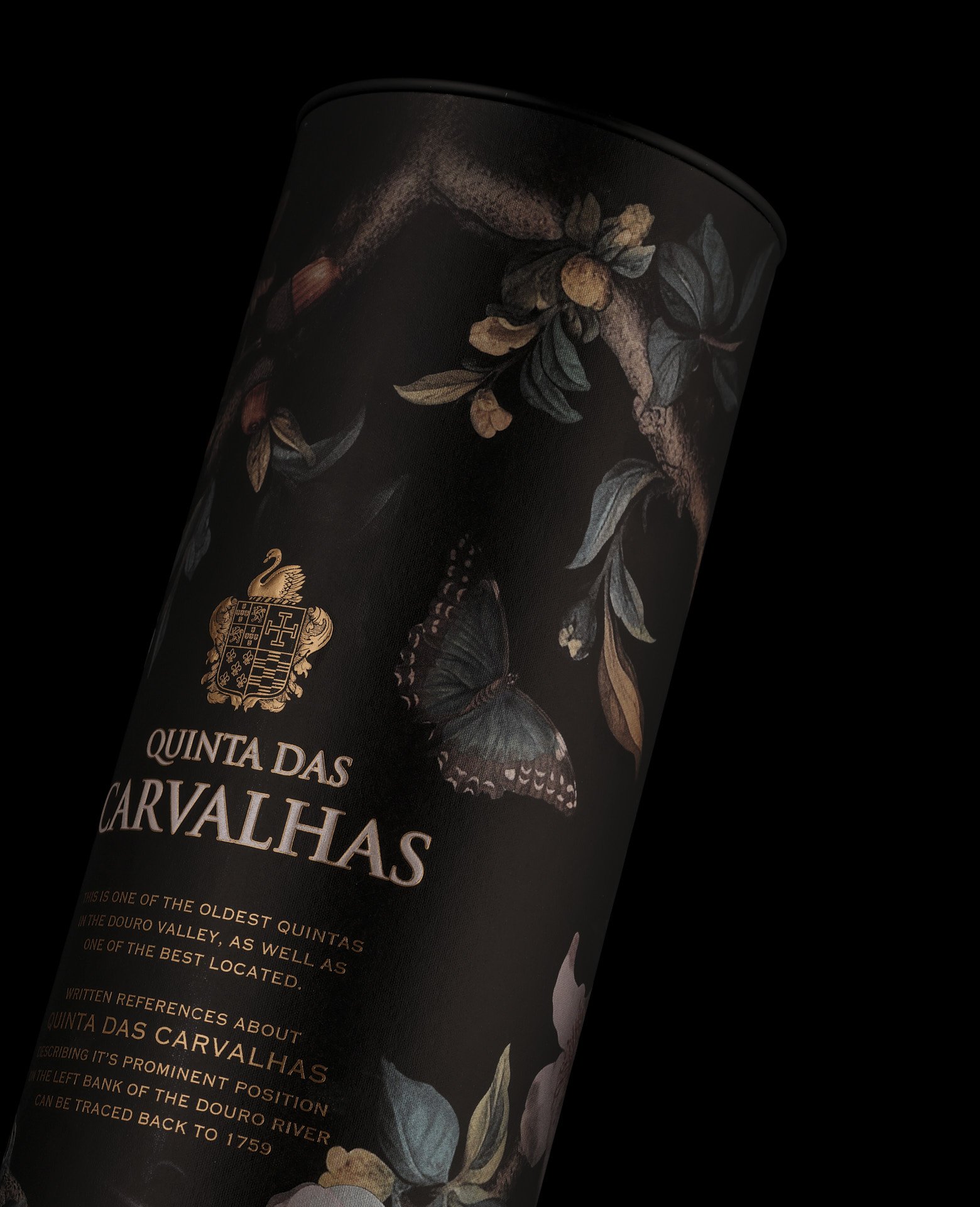 Quinta das Carvalhas is one of the most emblematic and spectacular property in the Douro Valley. Written references about this magnificent vineyard can be traced back to 1759, its old vines, of post-phylloxera plantation, are reaching the respectful age of one century. We’ve created the packaging design for Quinta das Carvalhas range, the package has a black background adorned with intricate floral and fauna illustrations, which create a luxurious and nature-inspired aesthetic. The text highlights the product's heritage and the overall design conveys tradition, elegance, and a connection to nature, appealing to a sophisticated audience.
