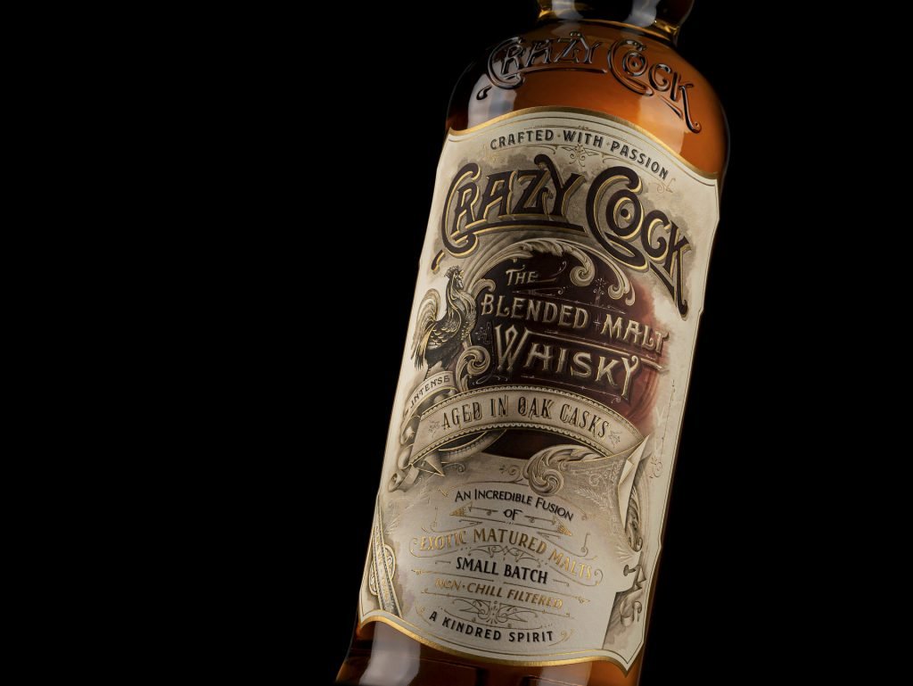 In some markets, you’ll be required to package the bottle in a box for regulatory reasons. For example, our client’s Crazy Cock whisky brand was primarily destined for sale in India, which meant it needed a box to hold the bottle. The brand had such a rich story to tell, and we designed the bottle and label with lavish typography and beautifully detailed illustration.